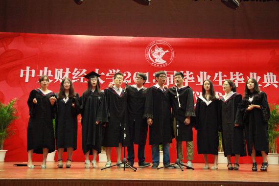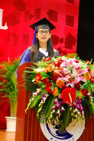 本科毕业生代表杨忠雨同学发言,用幽默诙谐的语言与同学们忆往昔、共回首,从沙河的稚嫩谈到本部的成熟,从成功的欢笑谈到成长的艰辛,表达了毕业生立足既往扬鞭前行的决心,也表达了毕业生感怀师恩永念母校的情谊。研究生毕业生代表王妲同学则回忆了两年研究生生涯的点点滴滴,表达了对学院的怀恋,对老师的感恩及对同学的不舍。在校生代表宁强同学在发言结尾清唱了一首《送别》为学长学姐们饯行,在那诚挚的歌声里,大家聆听到了在校生们对于学长学姐的不舍、感谢和祝愿,令不少在场毕业生潸然泪下。09保险精算班王天硕同学的父亲王子胜先生代表全体毕业生家长,感谢学校学院对孩子们的辛勤培育,感谢老师们对孩子们的谆谆教诲,期望孩子们心怀理想、展翅翱翔。