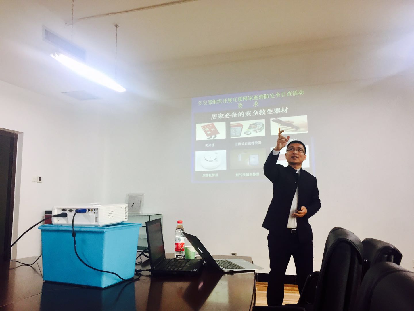 邵老师由模拟火灾实验引入,实验中,短短48秒时间即可烧毁一间装饰精美的房屋,引起全场教工一片惊叹。接着,邵老师通过案例分析的形式,就身边存在的安全隐患进行解读,如常用电器的正确使用方式、办公室和家庭的火灾隐患等,随后以相关视频对火灾出现时的应对措施加以分析,讲述在夜间这一高发时段如何发现灾情与及时处理,并对高楼建筑紧急逃生的姿势与方式进行现场模拟演示,结合我校主教高层建筑内部结构,合理规划逃生路线。最后,主讲人在强调灭火器、安全锤、防烟面罩重要性的同时,介绍其使用方式,同时分析烟雾报警器设计原理。邵老师指出,我校教室均装有报警器,整体安全防范性较高。