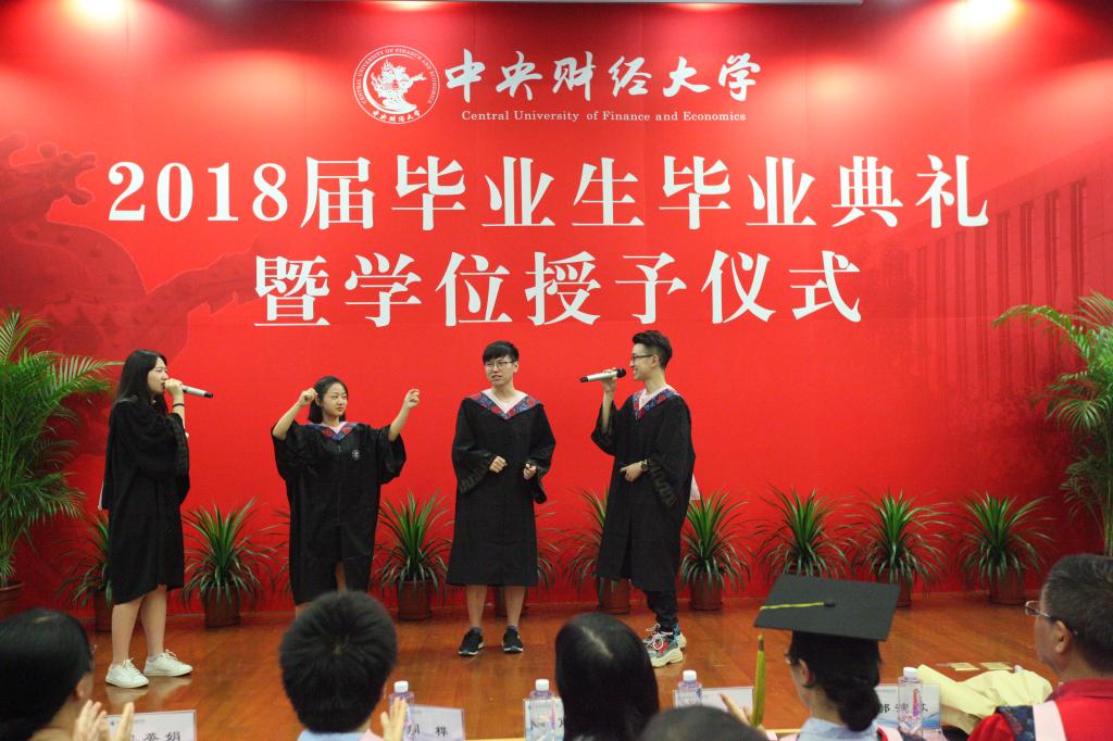 毕业生代表和研究生代表为全体毕业生带来了《你好,再见》和《仰望星空》,动听的歌声,悠扬的旋律,全体毕业生挥舞双手全场合唱,将典礼推向了高潮。