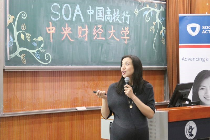 接下来,李晶鑫女士为同学们介绍了SOA的基本情况,并结合自身经历阐述了精算师的定义、职业发展历程和可能的工作领域。她还为同学们讲解了北美精算师考试的相关内容,包括网上模拟试题,官方微信微博等。她强调,精算师这一职业延展性是非常大的,除了传统的保险公司,精算师也可以在咨询公司、证券公司、政府机构等公司开展工作。同时,精算师们现在也可以借助新的技术手段来完善其在传统领域的工作,比如用手环来监测个人锻炼情况从而确定寿险产品定价等。在最后的互动问答环节,李晶鑫女士热情地回答了同学们的提问。