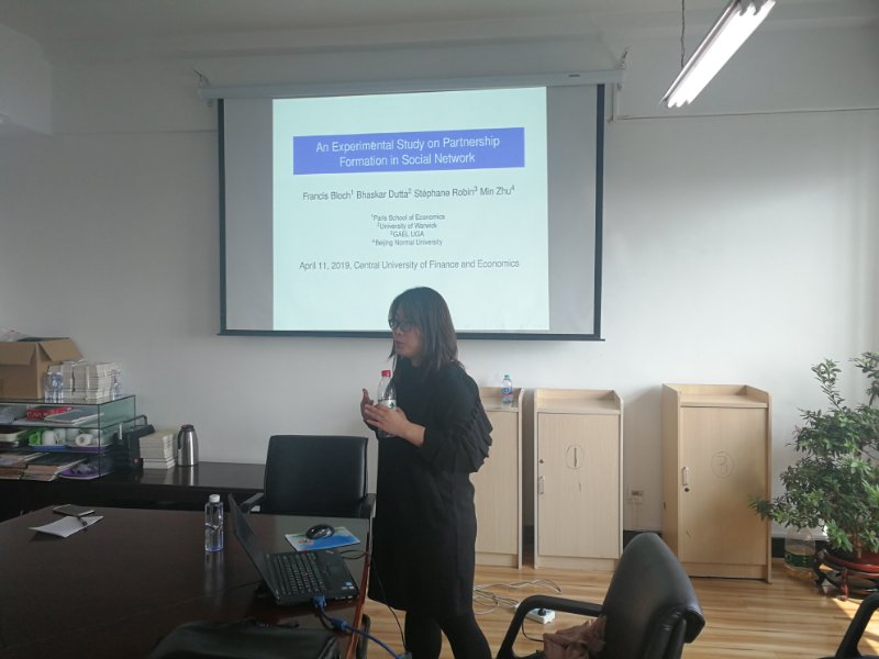 2019年4月12日下午,北京师范大学经济与工商管理学院讲师朱敏博士应伟德国际victor1946邀请,在我校学院南路校区主教1407室以“An experimental study of partnership formation in social networks”为主题开展讲座,伟德国际victor1946毛磊副教授主持了讲座。