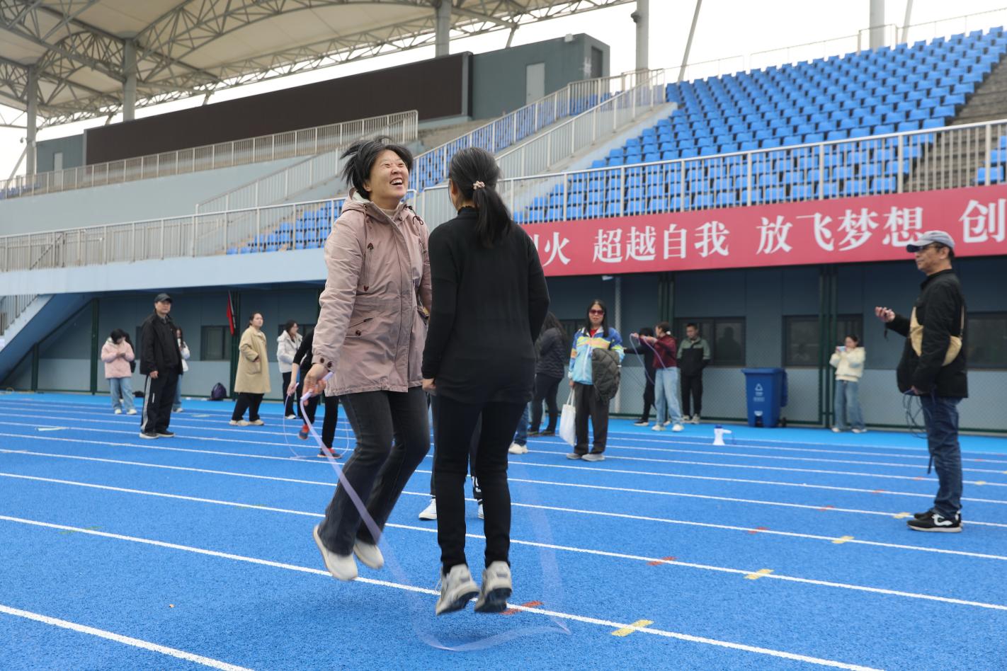 “‘一带一’双人跳绳”项目则格外考验老师们的默契与配合。两人一组,需要步调一致,节奏统一。赛场上,有的组合心有灵犀,一气呵成;有的组合虽偶有失误,但彼此鼓励、相视一笑的温馨场面,更传递出同事间彼此信任、携手共进的温暖情谊。