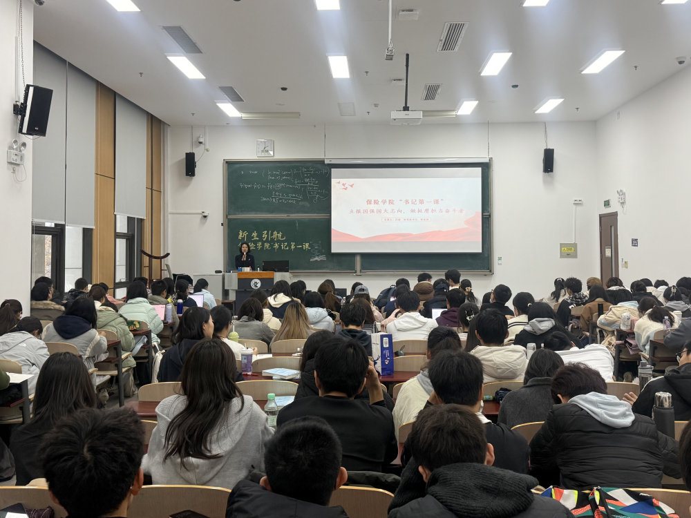 随后,吕丽以刚刚闭幕的党的二十届四中全会为切入点,深入浅出解读了全会精神,阐述了“十五五”规划在战略延续、方向引领和实践部署三个层面的重要意义。她强调,当前正处于实现社会主义现代化的关键阶段,中华民族伟大复兴进程势不可挡,而保险业作为“经济减震器”和“社会稳定器”,在保障民生、稳定经济、防范风险中作用关键。她鼓励新生主动学习贯彻全会精神,关注“五篇大文章”新“国十条”等行业政策风向,未来在服务国家社会保障体系建设、推动新质生产力发展中勇担保险学子的使命。
