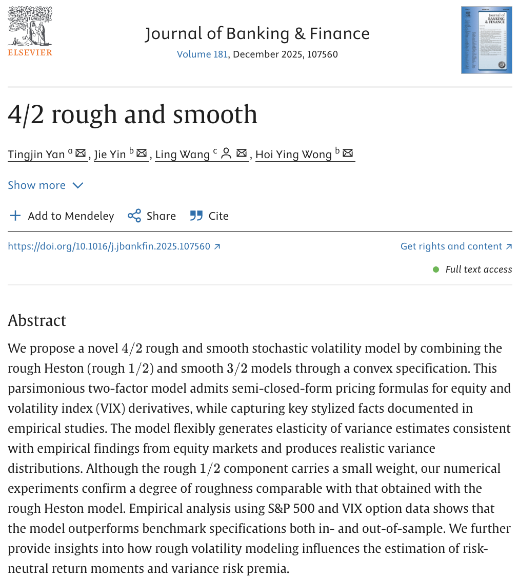 我院王玲助理教授与华东师范大学颜廷进助理教授、香港中文大学殷捷博士以及香港中文大学王海婴教授近日在我校AA类期刊Journal of Banking and Finance发表题为“4/2 rough and smooth”的合作论文。