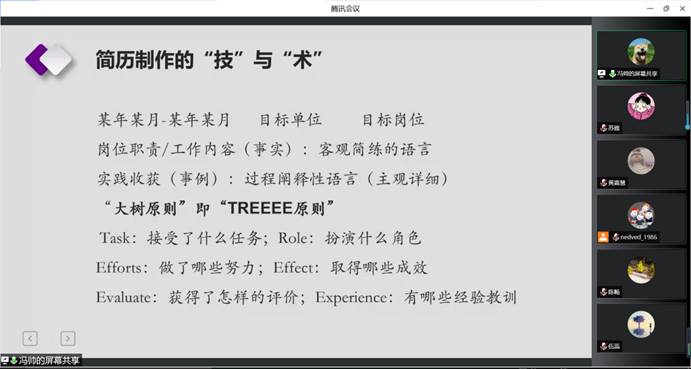 接着,冯帅老师从简历的制作逻辑、文体、“技”与“术”等角度出发,结合真实案例分析了简历撰写技巧。冯老师认为从制作逻辑来看,简历是用来帮助单位了解求职者基本信息、教育背景、实践经历和素质技能的工具;从文体来看,简历属于包含绪论、论点、论据和结论的立论文,需结合运用过程性阐释性和结果性结论性语言;从“技”与“术”的角度来看,冯帅老师认为简历撰写应遵循“可写可不写就不写”原则,把更多的空间留给关键有效的信息,巧用大树(TREEEE)法则和STAR法则凸显经历优势。
