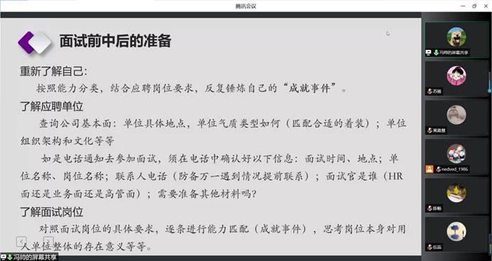 最后,冯帅老师就简历筛选、面试礼仪、面试分类、面试前中后各阶段的准备做了分享,让同学们对HR筛选简历的逻辑、面试中的常见问题有了更全面的了解。