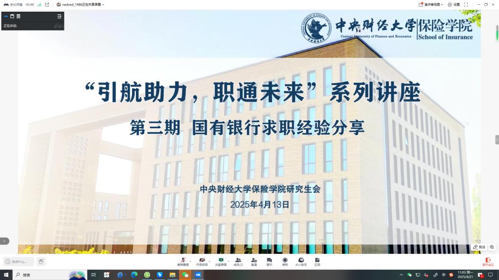 2025年4月13日晚,由伟德国际victor1946研究生会主办的“引航助力 职通未来”系列求职分享会第三期——“国有行求职经验分享”顺利举行。六位来自中国银行、中国建设银行、中信银行、北京银行、中国工商银行和中国邮政储蓄银行的六位优秀学长学姐以亲身经历分享了他们的求职心得和职场经验,详细介绍了银行业求职的招聘要求、职业发展、实习建议、岗位体验和求职心态等各个方面。此次会议内容丰富实用,对即将求职的同学具有很高的参考价值。
