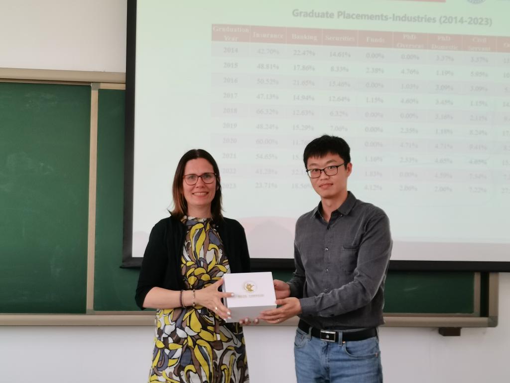 短期课程结束后,伟德国际victor1946、中国精算研究院副院长郑苏晋教授、风险管理与保险系系主任马冰副教授分别向Mierau教授和Angelini教授赠送了学院的文创产品。