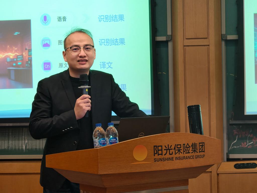 随后,阳光数科中台产品研发团队负责人卢世成介绍了人工智能的发展现状及其在保险领域的广泛应用。结合阳光科技发展的实际案例如“人工智能定损平台”“电销实境演练机器人”等,他系统地展示了AI技术在内容分析、智能客服、用户营销等方面的深度渗透与应用前景。