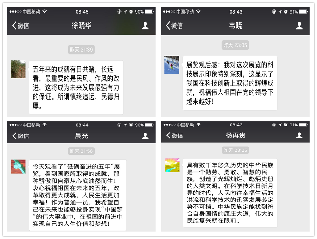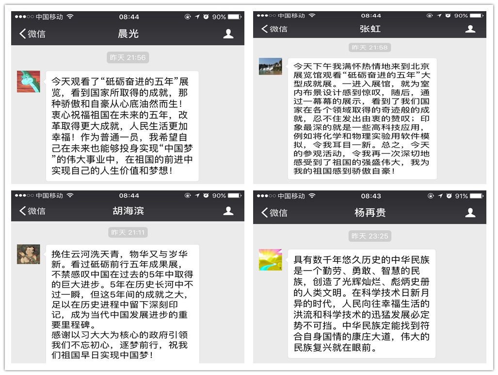 参观完展览后,老师们心潮澎湃,纷纷发来观后感,一位教工党员说:“十九大之后,国家将站在新的起点上。通过砥砺奋进的这五年,相信我们能共同实现两个一百年的伟大梦想!我们作为教育工作者,要将自己的工作职责与国家发展、民族复兴联系在一起,在自己的工作岗位上为了实现中华民族的伟大复兴贡献自己的光和热。”