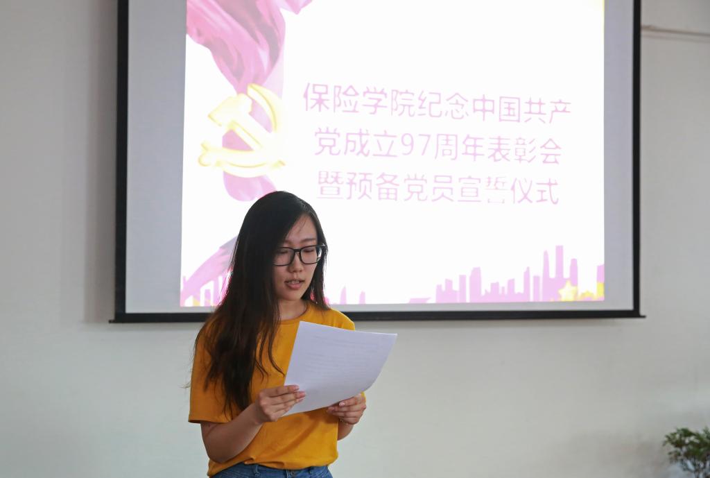 “优秀学生党员”代表:2016级保险学、社保、精算学研究生联合党支部党员王圆圆同学发言