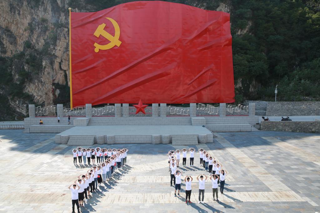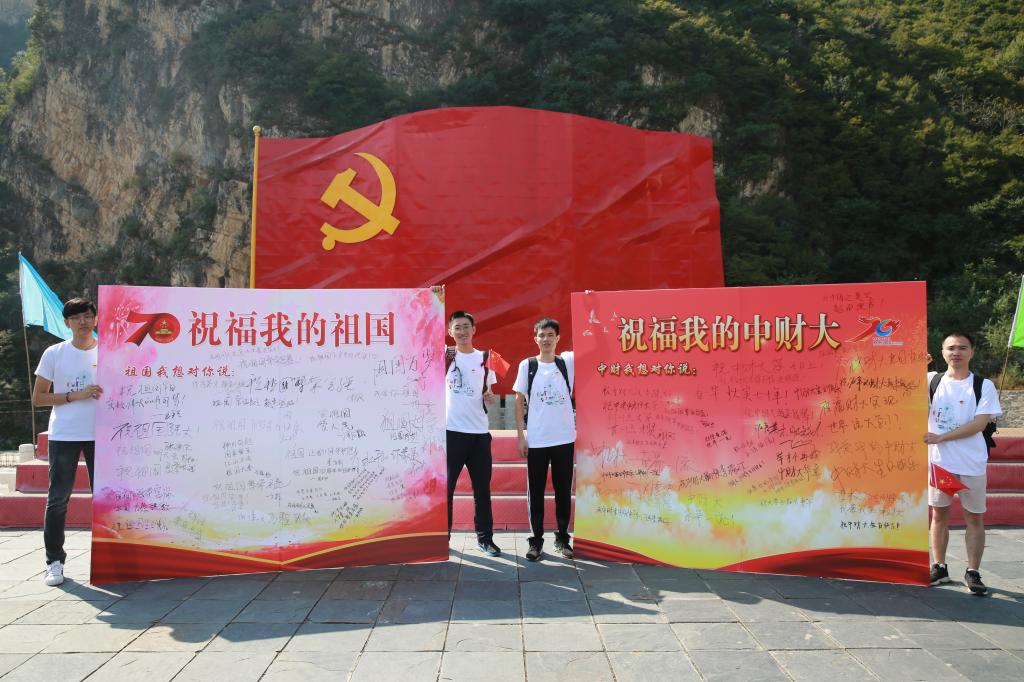 一面被称为“全国最大党旗”依山就势飘展在纪念馆对面的山梁上,与“没有共产党就没有新中国”纪念馆遥相呼应。全体党员在党旗广场的这面党旗下合影,共同呼喊出对祖国、对中财大的祝福。随后党员们在党旗下摆出“70”的字样,共祝新中国70岁生日快乐,祝中财大70岁生日快乐!