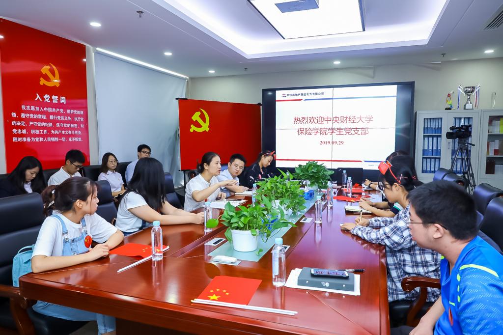在座谈会环节,双方进行了热烈交流,支部同学从中财70周年的历史出发,讲述了中财大从1949年的敢为人先,到2019的“财经黄埔”的光辉历程,同时结合保险专业特点,积极提出问题。北方公司党委副书记刘微对学生感兴趣的问题进行了认真解答,对保险融资、物资物流等公司转型业务做了详细说明,通过讲述公司在张家口万全区三里庄村“脱贫攻坚”事迹,强调了铁建人“舍小我,顾大家,舍自我,为国家”、争做“奋斗者”“奉献者”的精神,阐述了中国铁建“责在利先”的企业文化,学生们深受鼓舞与感动。