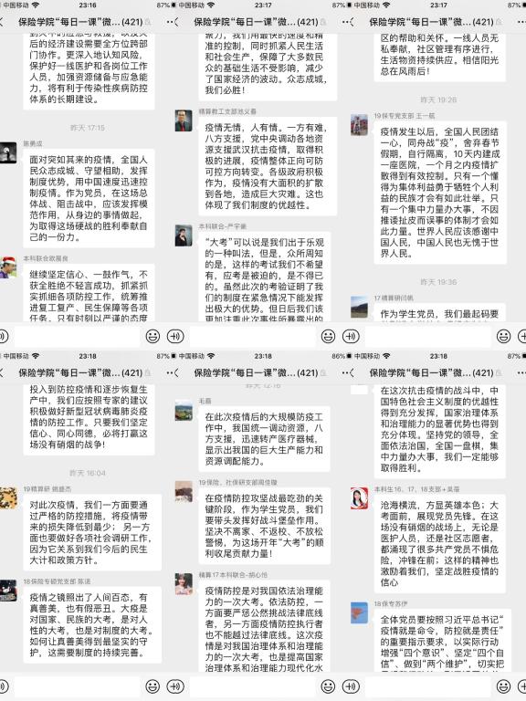 在交流讨论环节,师生党员纷纷表示:在这场总体战、阻击战中,承担责任从自身做起,不同的身份汇聚了共性的责任,配合国家政策,坚定信心,认真完成教学工作,积极参加社区志愿活动,传递科学健康知识,不信谣不传谣,不断提升自己的风险认知,曲突徙薪,在国家打赢防控疫情的过程中,贡献力量。在疫情期间,作为一名教师,我们在规范自身行为的同时也要做网络教学的践行者,通过网络同掌握了解学生的学习生活情况,对他们有针对性地进行关心和辅导,为战疫贡献自己的力量。
