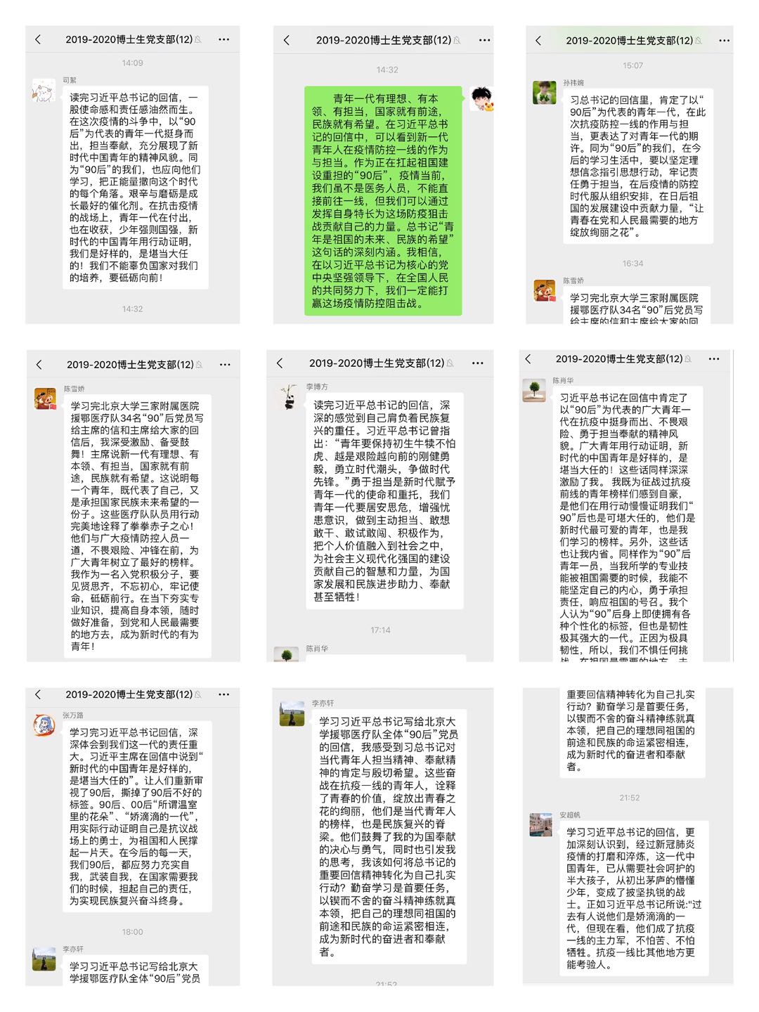 支部积极分子陈雪娇:学习完北京大学三家附属医院援鄂医疗队34名“90”后党员写给主席的信和主席给大家的回信后,我深受激励、备受鼓舞!主席说新一代有理想、有本领、有担当,国家就有前途,民族就有希望。这说明每一个青年,既代表了自己,又是承担国家民族未来希望的一份子。这些医疗队队员用行动完美地诠释了拳拳赤子之心!他们与广大疫情防控人员一道,不畏艰险、冲锋在前,为广大青年树立了最好的榜样。我作为一名入党积极分子,要见贤思齐,不忘初心、牢记使命,砥砺前行。在当下夯实专业知识,提高自身本领,随时做好准备,到党和人民最需要的地方去,成为新时代的有为青年!