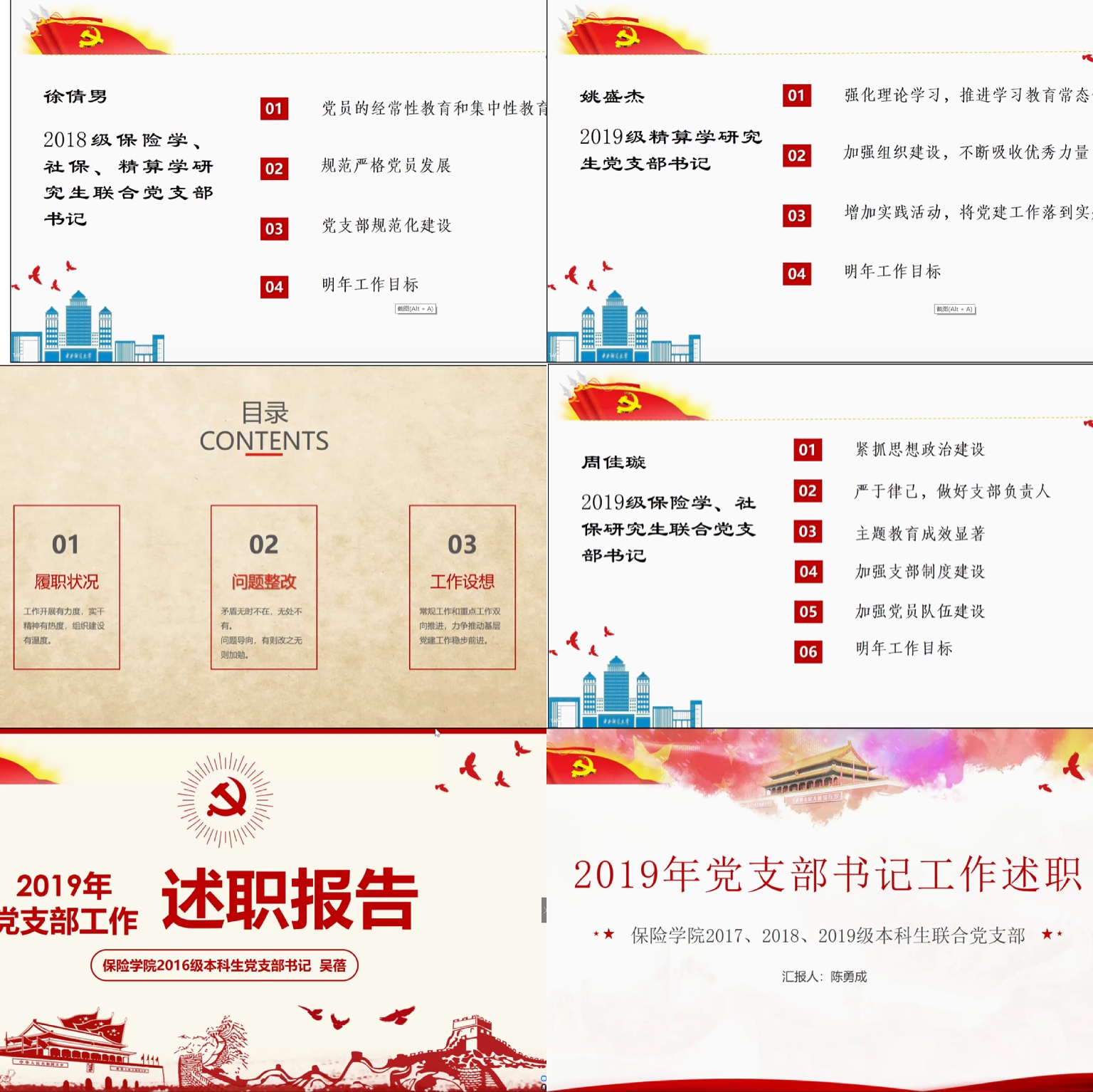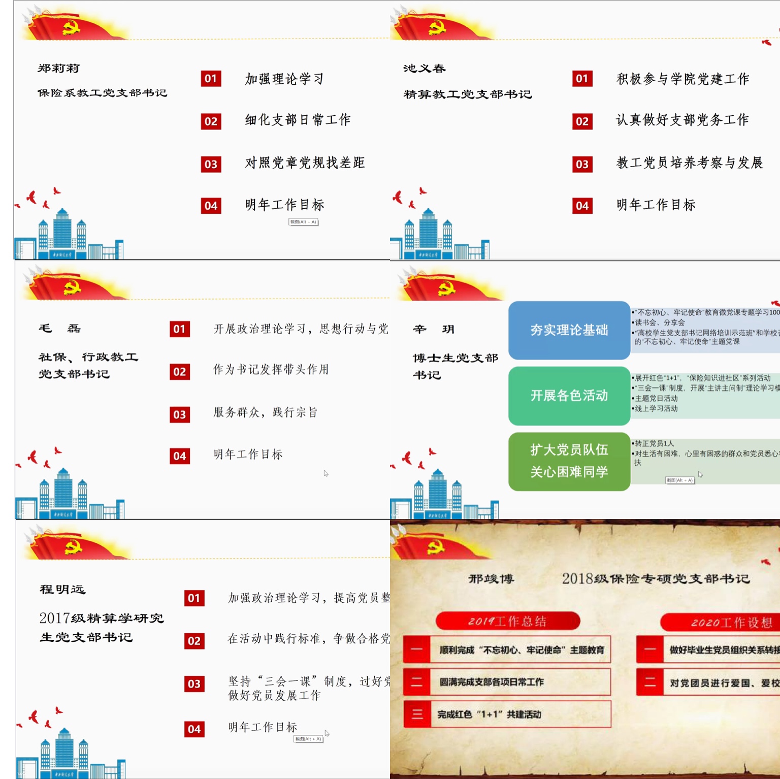 2019级保险专硕党支部书记王一航从开展“不忘初心、牢记使命”系列活动、学思并重、组织建设三个方面进行了履职汇报。分析了支部存在积极分子党员E先锋信息不全、支部部分同志学习强国活跃度不够、档案审查不全面等6个问题,并有针对性地提出了2020年工作设想。