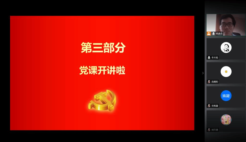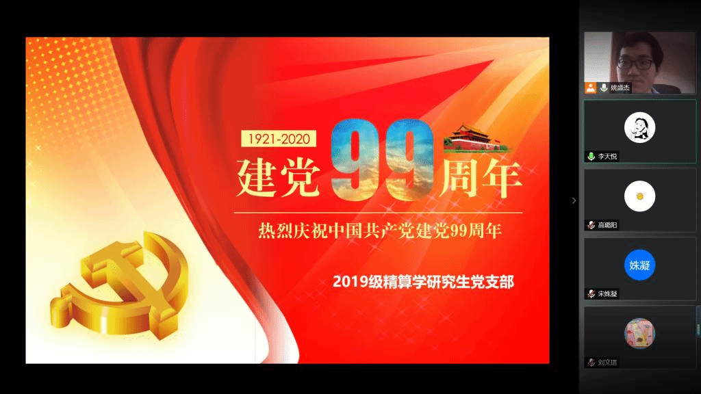 九十九年风雨兼程的峥嵘岁月书写了中国共产党人不畏艰险、勇于奋进的光辉历史,每一位党员同志都曾在中国共产党的历史中找到感动和力量,都曾在共产党党员的故事中领悟梦想和坚持。一路走来,时代在进步,而共产党员的使命却从未改变,值此中国共产党建党99周年的特别时刻,2019级精算学研究生党支部于6月26日开展了“庆祝中国共产党建党99周年线上主题党日活动”,出席会议的有党支部书记姚盛杰、组织委员李天悦、宣传委员胡涛和全体党支部成员,由姚盛杰同志主持本次会议。