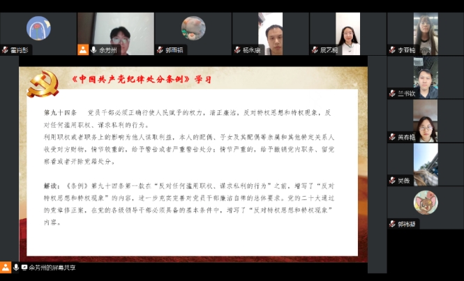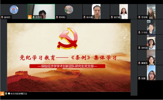 为贯彻落实学校、学院党委关于推进党纪学习教育工作的要求,确保支部党员弄懂学通新修订的《中国共产党纪律处分条例》,5月23日下午,保险经济学学术创新研究生党支部召开《中国共产党纪律处分条例》集中学习研讨。会议由党支部书记陈华主持,全体党员参会。
