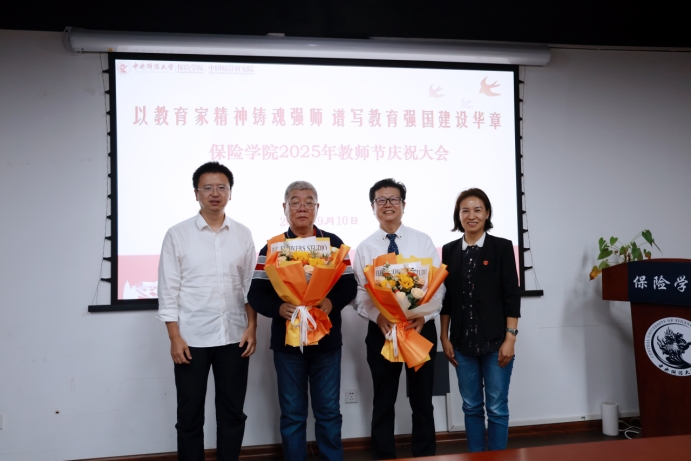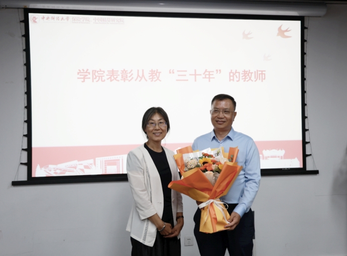 随后的“青蓝相继,共铸师魂”老中青教师结对仪式将大会推向高潮。三组结对教师依次登台,开启学院“有组织传帮带”的新征程:北京市教学名师许飞琼教授与系主任马冰、新教师卢森结对;首届“中财好老师”李晓林教授与系主任刘敬真、新教师刘畅结对;校优秀共产党员标兵褚福灵教授与系主任张建伟、新教师艾美彤结对。新教师向老教授献上鲜花,骨干教师为新教师赠送承载学科智慧的书籍。老教授们分享了带教计划并谆谆寄语,强调“传承师道、共育新人”的责任;骨干教师系主任们表态将全力支持新教师成长;青年教师畅谈职业规划,展现昂扬风貌。这场庄重温馨的仪式,构建起“老教授定方向、骨干教师搭框架、青年教师填新料”的协同发展模式,让师道传承在学院落地生根。