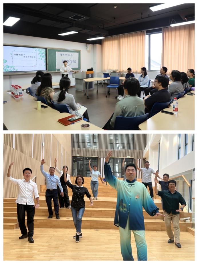 学院高度重视教师身心健康,特邀专业心理教练、校友应晓喻开展“心灵按摩”沙龙,带领大家辨析关于情绪的大众迷思,理解情绪的运作真相与科学应对原则,并通过正念冥想、情绪调节等体验活动,帮助教师缓解了工作压力、提升心理韧性。同时,学院发挥有武术专业背景教师的特长,由燕东老师带领学院教师练习八段锦工间操,在舒缓压力的同时增强身体素质,提升团队凝聚力。