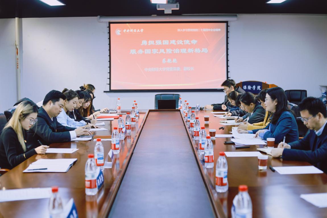 蔡艳艳副校长以《勇担强国建设使命,服务国家风险治理新格局》为题,向与会师生讲授了一堂内涵丰富、思想深刻的党课。蔡艳艳副校长首先强调要深刻把握党的二十届四中全会精神的核心要义。她强调全会审议通过的“十五五”规划建议中明确提出“加快建设金融强国”的战略目标,中财大师生要认清方位,勇担使命,在服务国家战略中展现“中财大担当”。接下来,蔡艳艳副校长从国家治理、金融强国、全球治理三个维度为保险、精算和社会保障专业学科发展提出新期望。她指出,作为新质生产力的组成部分,有社会经济的“稳定器”和“减震器”之称的保险业在建设金融强国、做好金融“五篇大文章”的战略作用更加凸显,而精算科学在风险评估与制度设计中的应用能优化社会保障政策的精准性和可持续性,对国家治理的重要意义不言而喻。因此,专业学科的发展要紧密围绕国家治理现代化、金融强国建设和全球治理深化等战略需求,通过强化人才培养、推动理论创新与实践融合,为经济社会高质量发展提供支撑。