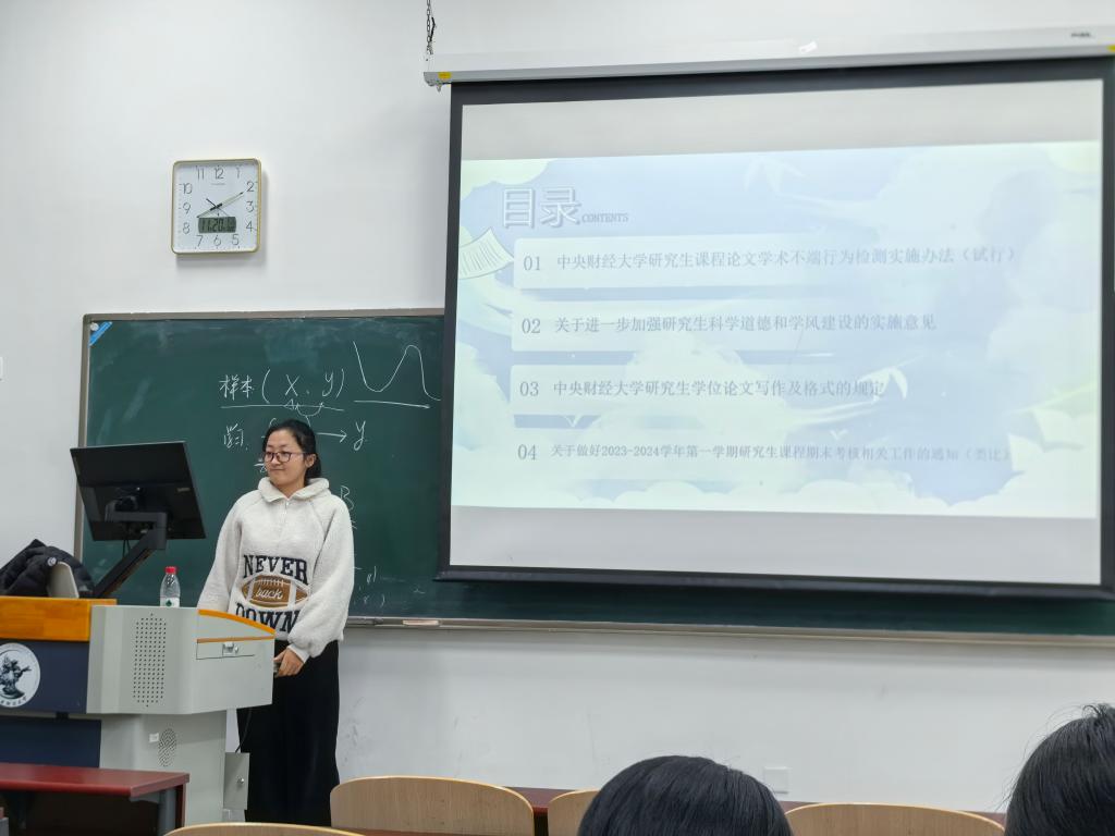 2024年11月13日,2024级保险专硕全体同学在二教108举办了由学习委员张淑敏组织的学术诚信主题班会。此次班会以“研而有信,筑梦学术”为主题,主要就科学道德和学术规范、诚信考试等相关议题展开,以弘扬学术诚信精神,树立良好学术风气。