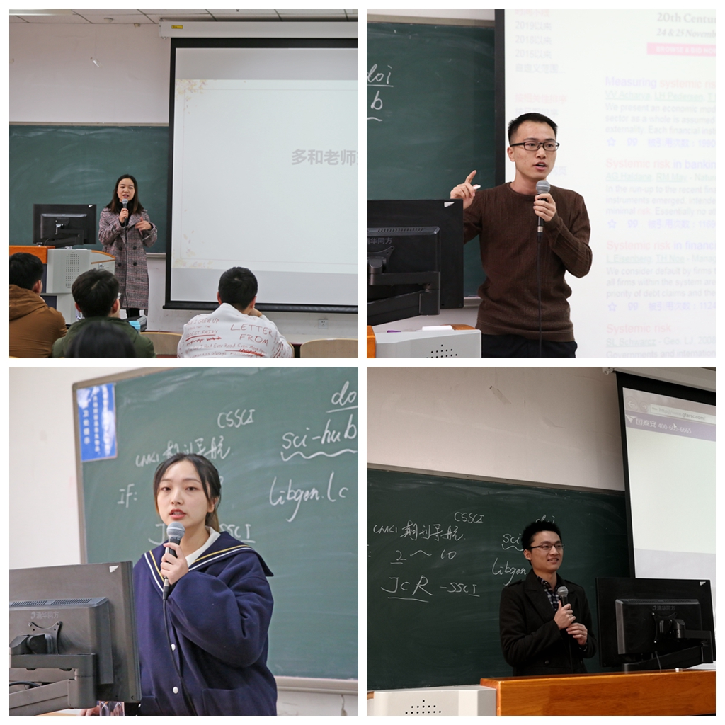 首先,四位国奖得主分别分享了他们在学习、科研等方面的经验。2017精算研冯燕从“加强交流”、“多读书,多学习”、“着手去做”、“常怀感恩之心,诚实做人,踏实做事”四个方面分享了自己的经历,为我们传递了学习经验,并从生活上对学弟学妹予以指引。她表示,寻找兴趣点是学习和研究的关键,我们要积极利用图书馆的资源来挖掘自己的兴趣,填补知识的空缺,要勇于迈开第一步,要用感恩的心来面对老师和同学,踏踏实实做事,诚诚实实做人。2018保险研宁定宸则围绕着“如何找文献”、“如何找教材”、“如何阅读文献”、“读完文献后该做些什么”四方面对如何做科研进行了细致分析。他详细介绍了谷歌学术、JCR等论文搜索工具,并现场进行了演示,让同学们受益匪浅。2019级保险专硕司语琳以“数据和计量”为主题,现场演示了如何有效使用我校现有的数据库,并推荐了一些高水平的计量经济学的网课供同学们参考,极具实用性。2017精算研王奕可则从“问题深挖”和“效率”两方面对同学们提出了建议,告诫同学们要注重平衡约束条件和结论严谨性之间的关系。