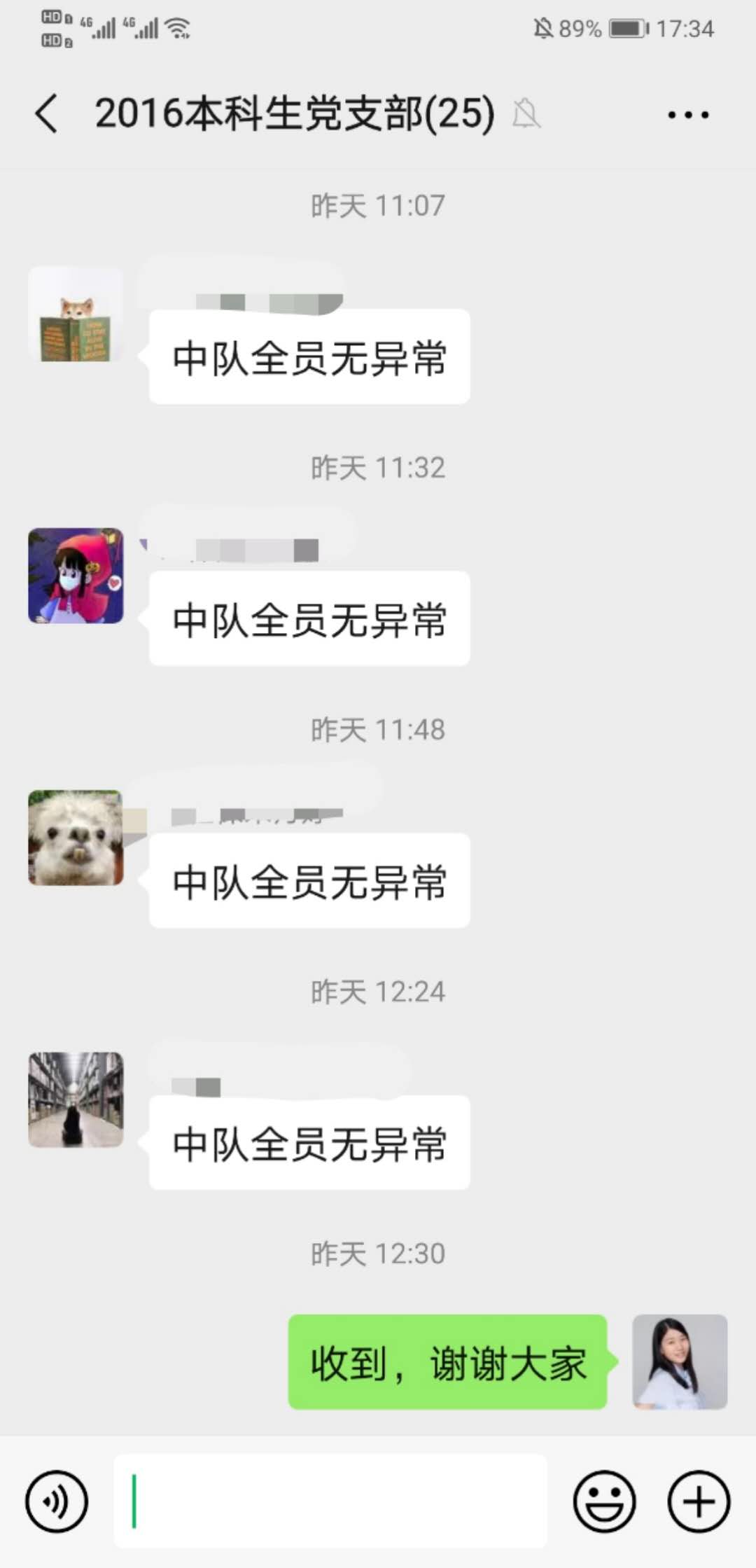 为打好“主动仗”,伟德国际victor19462016级本科生党支部党员走在前,做表率,充分发挥党员同志在疫情防控中先锋作用,一个党员成为一面旗帜。党支部开展以党员为小组长,支委为中队长,支部书记为大队长模式,每日定时点对点联系每位同学,做好疫情防控,情绪安抚工作,确保所有同学“配合防控、听从安排、强健身体,充实生活”。