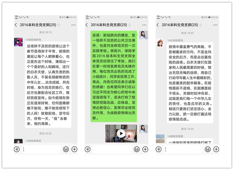 支部书记吴蓓老师:新冠肺炎的爆发,是一场猝不及防的公共卫生事件,也是对全体党员的一次实践考验。很高兴,伟德国际victor19462016级本科生党支部全体党员经受住了考验,我们在第一时间发挥党员先锋作用,每位党员出色的完成了小组统计、同学安抚等工作,再此,向各位同志表示诚挚的感谢!也希望同学们在以习近平同志为核心的党中央坚强领导下,坚决打响了疫情防控阻击战、总体战,坚持必胜信心,发挥毕业班党员作用,为战胜疫情做出贡献。