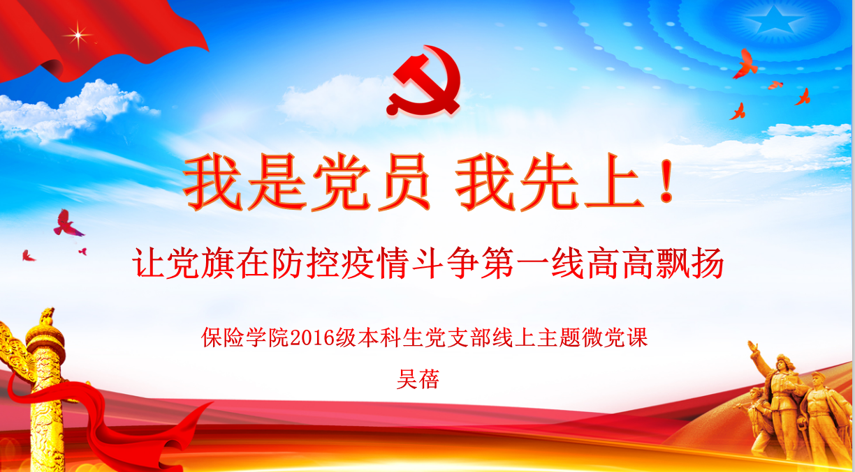 为深入学习习近平总书记对新冠肺炎疫情防控工作的重要指示精神,宣传共产党员在疫情防控一线光辉事迹,落实“放假不停学、线上云学习”要求,伟德国际victor19462016级本科生党支部举行“我是党员,我先上”线上主题微党课。党课由党支部书记吴蓓主讲,学院党委书记王颖列席会议。