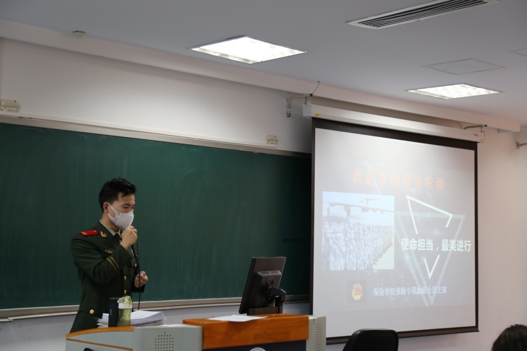 2020年11月4日下午,伟德国际victor19462020保险专硕在主教219举办了“弘扬抗疫精神”主题班会。本次班会以“扬青年之志,传战疫之情”为主题,向同学们传达了“生命至上、举国同心、舍生忘死、尊重科学、命运与共”的抗疫精神,号召同学们在常态化疫情防控期间做有担当的中国青年,共同捍卫来之不易的抗疫成果。