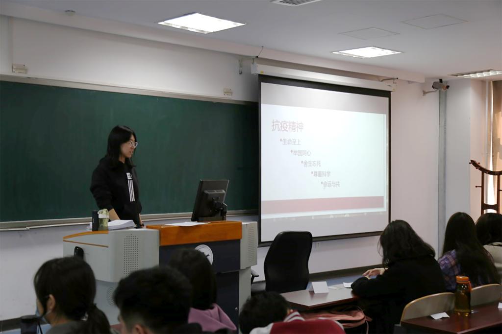 随后,同学们分享了个人在疫情期间的所见所感。同学们积极发言,现场热烈。有的同学讲述了自己父母作为医生,在疫情期间的忘我工作,表达了对一线医护人员的担心与钦佩;自己则通过在家的良好的后勤服务为父母提供有力的支持,间接为抗疫提供力所能及的帮助;陈伟同学从退伍军人的角度,讲述了军人的冲锋在线,表达了身为中国军人的担当与热血,让全班同学听得热血沸腾,深切感受到了军人的责任担当和义无反顾。