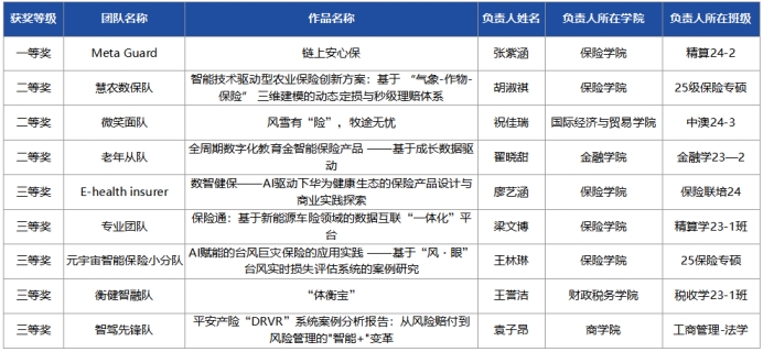“E-health insurer”团队融合华为健康生态数据与AI技术,打造交互式智能健康保险产品;“专业团队”搭建“保险通”平台,破解新能源车险“信息孤岛”问题;“元宇宙智能保险小分队”基于AI技术探索台风巨灾保险应用;“智驾先锋队”解析平安产险DRVR系统,实现驾驶风险识别与保费动态挂钩;“老年从队”运用AI与大数据设计全周期教育金保险;“衡健智融队”打造“线上+线下”双体系健康险,覆盖中年群体需求;“微笑面队”构建畜牧业智能保险方案,实现精准定价与全链条服务;“慧农数保队”结合AI与区块链技术,打造农险分钟级感知、秒级理赔体系;“Meta Guard”团队融合生成式AI与区块链,破解虚拟财产保障难题。