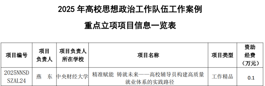 近日,教育部高校思想政治工作队伍培训研修中心(南宁师范大学)公布了2025年高校思想政治工作队伍工作案例立项项目名单,我院燕东老师负责的2个案例项目获批立项。其中,《精准赋能 铸就未来——高校辅导员构建高质量就业体系的实践路径》工作精品案例获批重点项目立项;《善用数字技术 破解网络沉迷》学生辅导案例获批一般项目立项。