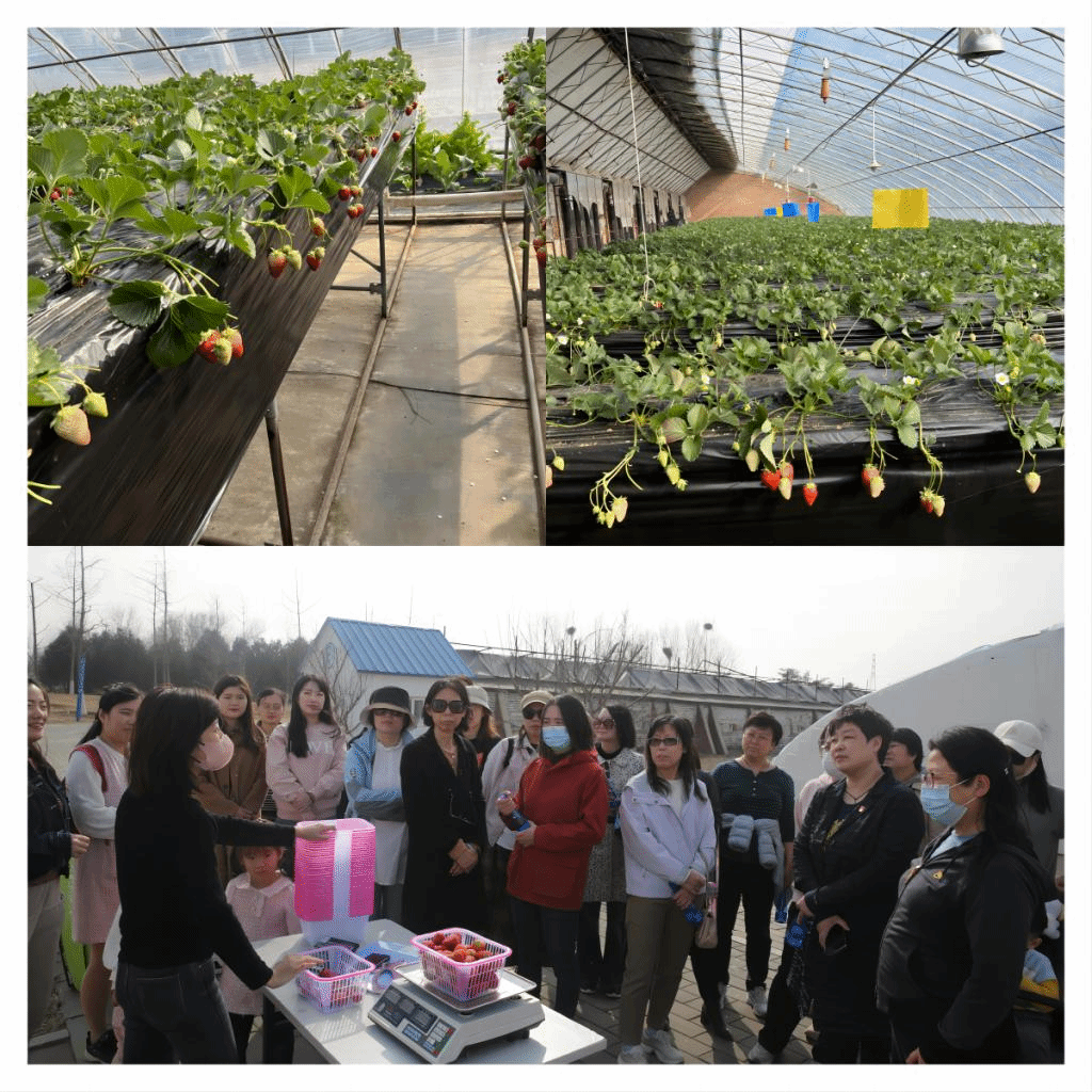 健步走结束后,女职工们一起前往参观草莓种植基地。在温室大棚里,老师们参观了圣诞红、红颜、隋珠等多种品类的草莓,听工作人员讲解了农业园内现代化的种植技术,还用相机记录下了草莓的生长情况。