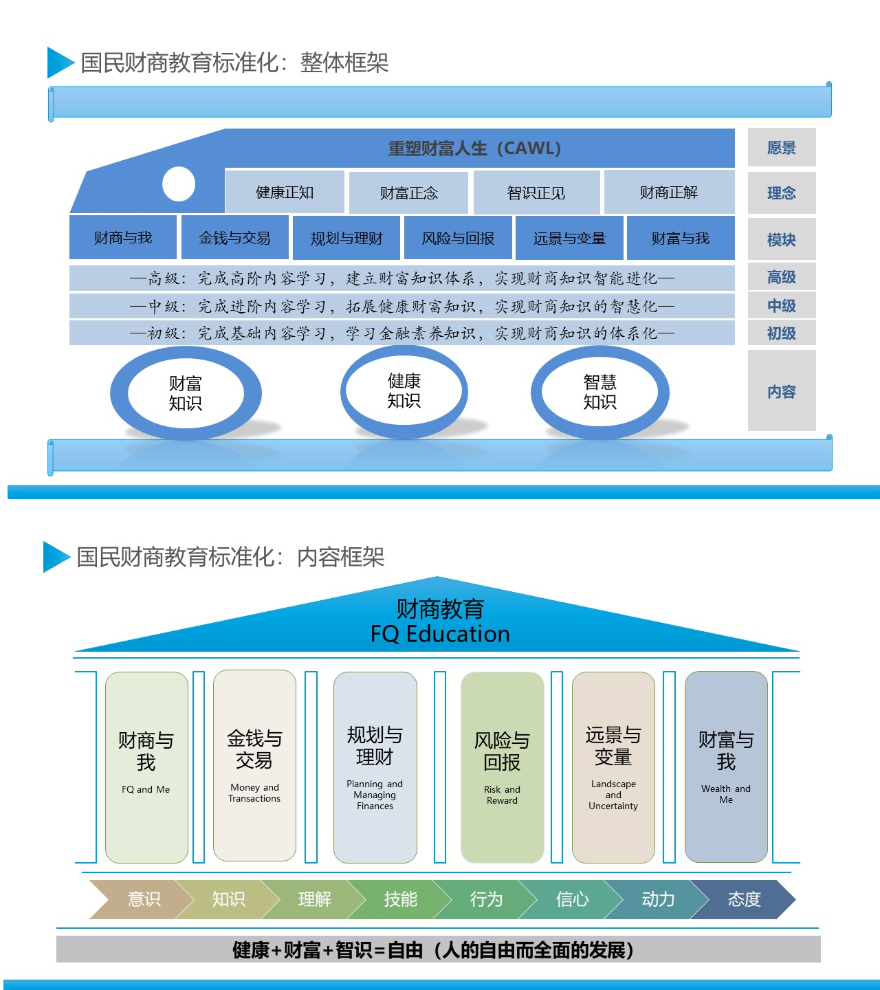 “三”即财商教育的三个目标,分别为健康(Health)、财富(Wealth)和智识(Wise)。健康财富智识/智慧(Healthy Wealthy and Wise,HWW)构成了财商教育的结果型目标——实现“人的自由而全面的发展”(Free and Comprehensive Development of Human Beings),这正是马克思主义追求的根本价值目标,也是新时代金融素养教育的根本目标。