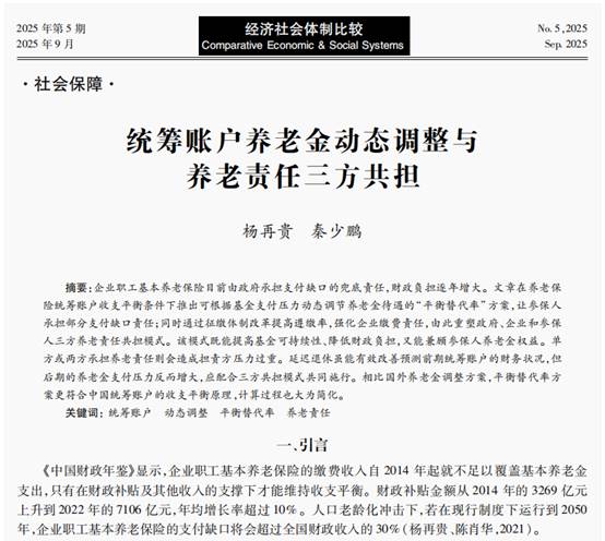 近日,我院杨再贵教授和秦少鹏博士的合作论文《统筹账户养老金动态调整与养老责任三方共担》发表在重要期刊《经济社会体制比较》上。