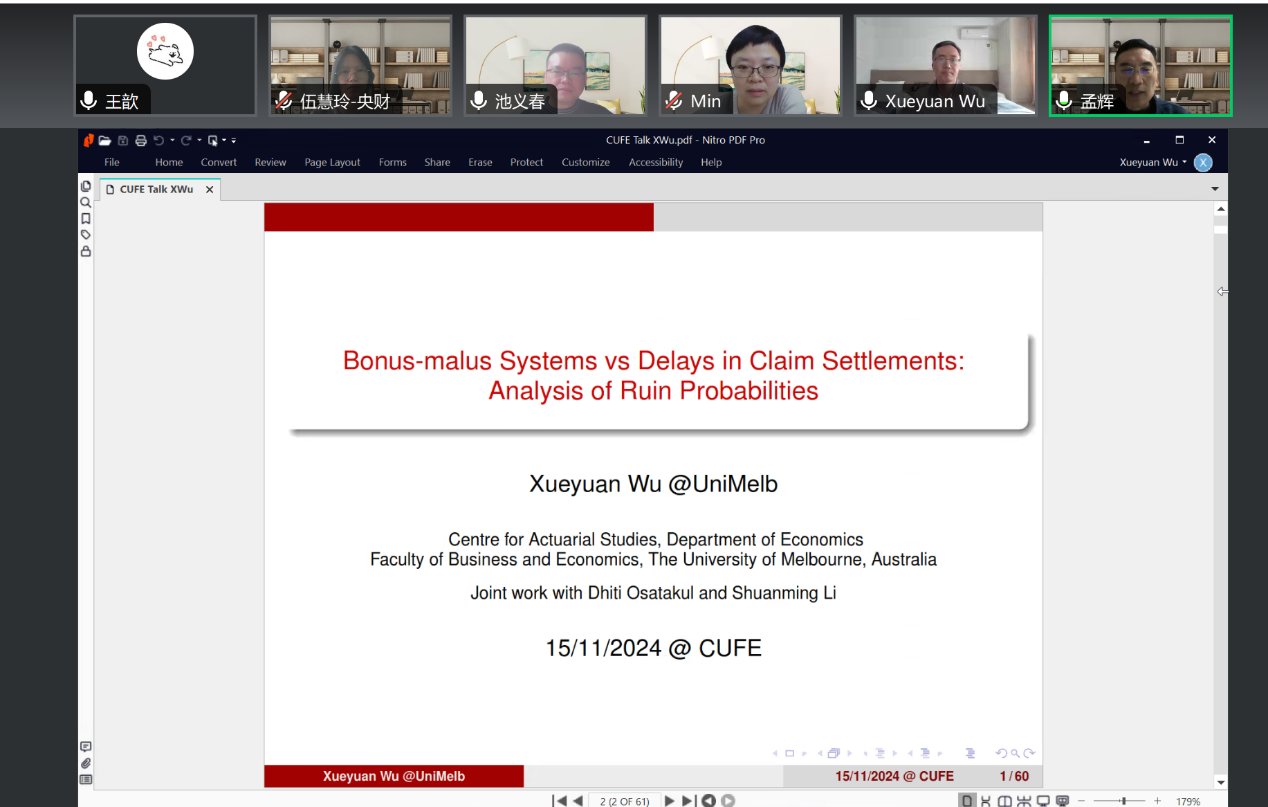 2024年11月15日,中国精算研究院成功举办了第249期精算论坛,主题聚焦于“Bonus-malus Systems vs Delays in Claim Settlements: Analysis of Ruin Probabilities”。论坛荣幸邀请到澳大利亚墨尔本大学经济及工商管理学院精算研究中心的吴学渊副教授、博士生导师作为主讲嘉宾。吴教授不仅是澳大利亚精算师协会的准精算师,还拥有超过18年的国际教学经验,并在风险理论、精算统计和机器学习等领域发表了近40篇学术论文。
