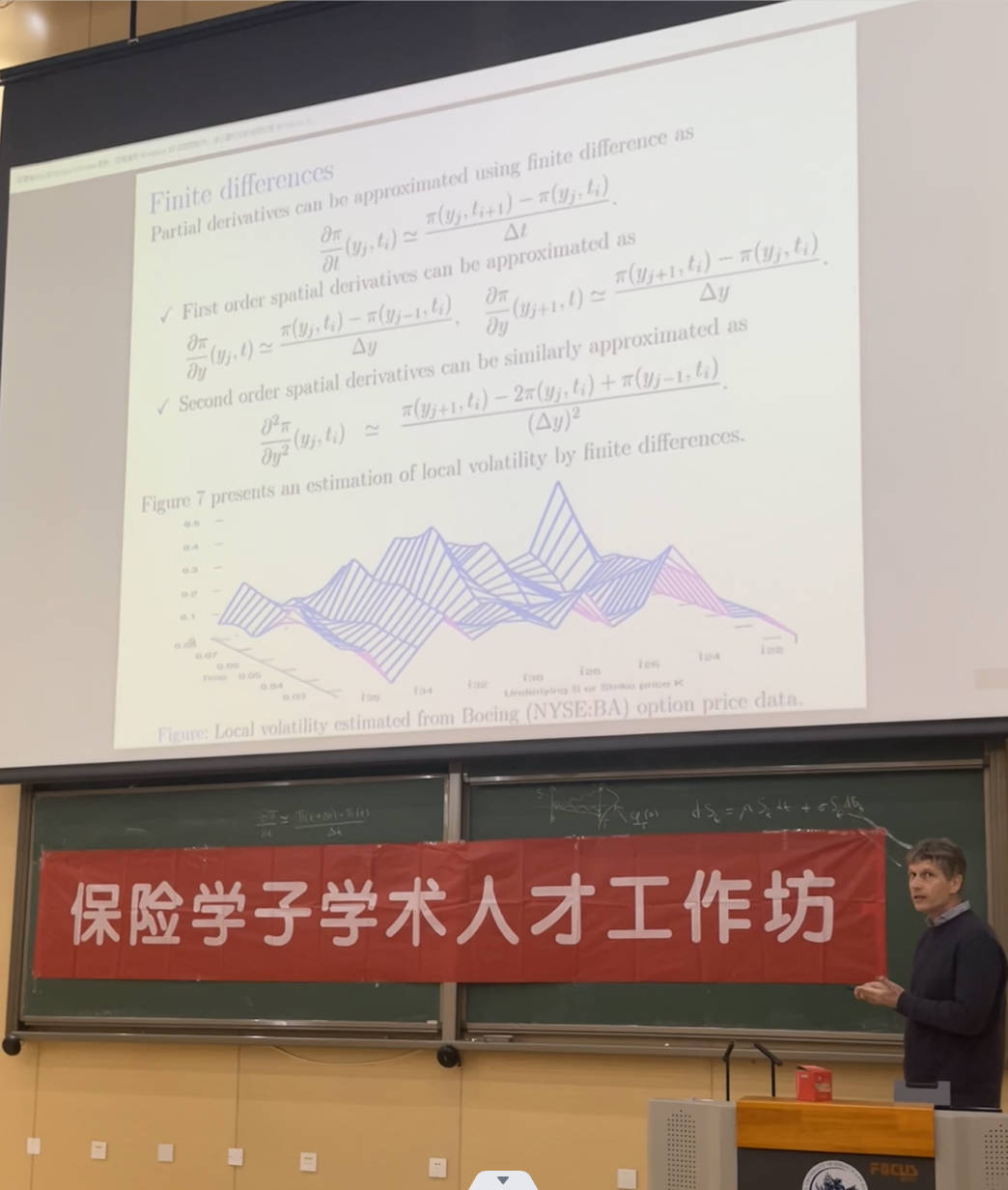 Nicolas Privault教授在报告中回顾金融市场波动率估计的四种方法,历史波动率、隐含波动率、局部波动率,与VIX指数。接着Privault教授结合热门的机器学习方法,用诙谐幽默的语言生动有趣地展示了用于自洽估计局部波动率的神经网络算法,并与同学们热切交流。最后,Nicolas Privault教授也简要介绍了新加坡南洋理工大学的相关的硕士项目,为有意向去新加坡深造的同学提供了第一手资讯。