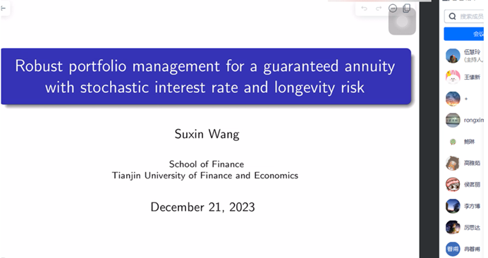 2023年12月21日下午2点,伟德国际victor1946中国精算研究院精算论坛第239期在腾讯会议在线举行。本次论坛邀请到来自天津财经大学金融学院的王愫新副教授,她为与会师生做题为“带有长寿风险和利率风险的保证年金投资管理”的学术报告,讲座由伍慧玲研究员主持。
