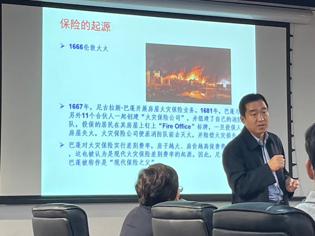 在第一部分定价对保险的影响中,李晓翾先生以1666年伦敦大火为例,讲述了相互独立的风险转变为巨灾风险的过程。人类对风险认识经历了从定性、定量再到定价的过程,李晓翾先生用一个简化的骰子模型为例,深入浅出地讲解了保险企业的风险、亏损、破产以及偿付能力的概念,指出再保险是改善偿付能力、降低破产概率的最优方式,并以简单的利润表为基础让大家设计再保险方案,师生互动,令大家耳目一新,印象深刻。