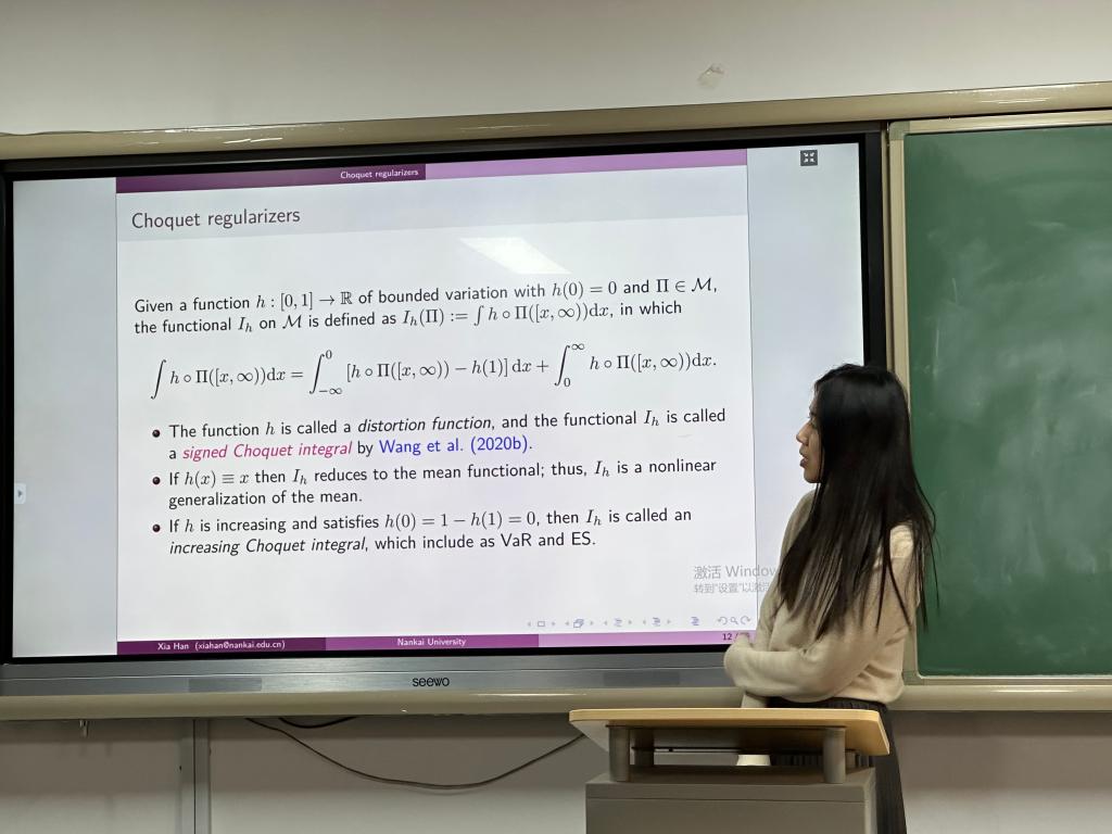 在报告中,韩老师首先深入浅出地阐释了Choquet正则化的基本概念、形式与性质,突出其在度量模型探索过程中不确定性的优势。她指出,Choquet正则化的方法与传统依赖于Shannon信息熵的正则化手段相比,它可以在不同策略分布下进行探索,而并非仅限于正态分布。为了更清晰地理解Choquet正则化与探索分布之间的关系,韩老师通过LQ问题,向同学们展示了不同探索分布下所对应的Choquet正则化算子的显式形式。在讲座的后半段,韩老师就经典的均值方差问题,向同学们介绍了在该框架下使用强化学习提升策略的算法。同时,她通过数值模拟的方法,向同学们展示了在市场环境未知条件下,采用不同策略分布进行探索的动态过程,并强调了该算法框架具有的收敛性。