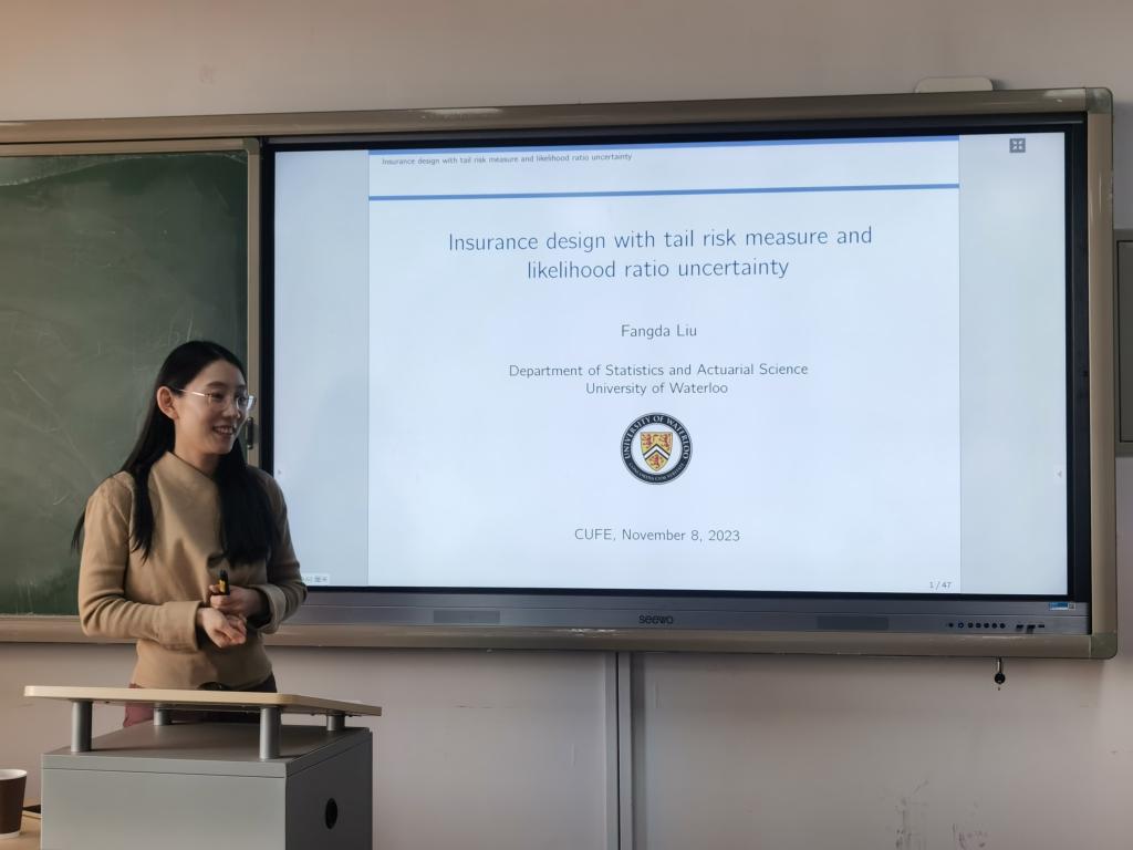 2023年11月8日下午14:00,伟德国际victor1946中国精算研究院精算论坛第231期在沙河校区13号学院楼205举行。本次论坛邀请到来自加拿大滑铁卢大学统计精算系的刘芳达老师,她为与会师生做题为“Insurance design with tail risk measure and likelihood ratio uncertainty”的学术报告,讲座由池义春研究员主持。