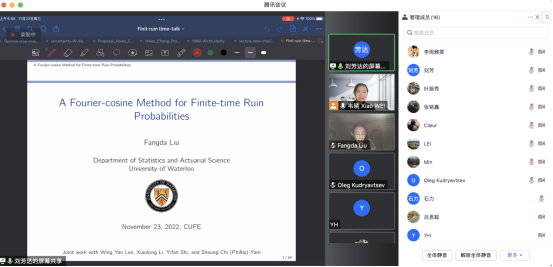 随后,刘芳达老师分享了她运用傅立叶余弦方法测算保险公司的有限时间破产概率的研究。刘老师从用Levy模型对保险公司盈余建模,引入了保险公司的有限时间破产概率的概念,指出了保险公司的有限时间破产概率往往难以得到其显式表达式,需要借助数值方法来计算,在金融定价中提出的傅立叶余弦方法可以用于解决该问题。而在运用傅立叶余弦方法计算有限时间破产概率时,初始准备金严格大于0的情形比初始准备金等于0的情形,要复杂很多,需要更精细的技巧处理,因此她先介绍了初始准备金等于0的情形下运用傅立叶余弦方法计算有限时间破产概率的原理,然后再介绍始准备金大于0的情形下如何对傅立叶余弦方法进行修正以获得更好的计算结果。最后刘老师也展示了在几种Levy模型下,运用傅立叶余弦方法测算保险公司的有限时间破产概率的数值结果。结果表明,在满足一定的条件下,运用傅立叶余弦方法及其修正方法计算保险公司的有限时间破产概率能把误差控制在目标区间内。