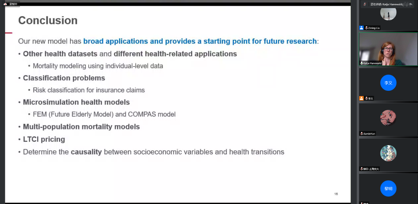 参与讲座的多位老师和学生和Katja进行了深入的讨论,包括并不限于机器学习的运用、因果分析和机器学习的结合以及健康状态转移矩阵的估计等。