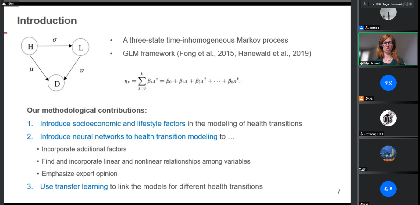 Katja教授以“Long-term care and mortality modelling using neural networks and survival trees”为主题,介绍了她最近的两篇文章,两篇文章均基于中国健康长寿纵向调查数据(CLHLS),关注了神经网络和生存树等方法在健康状态转移概率和死亡率预测中的应用。首先,在第一篇文章中,Katja介绍了将神经网络引入到健康状态转移概率估计的模型中,并且考虑了社会经济和生活方式等影响因素,允许变量之间存在线性和非线性关系,通过迁移学习的方法将研究健康状态转移的不同模型联系起来,从而改进对健康状态转移概率的估计。其次,在第二篇文章中,Katja将生存树与经典的参数模型相结合,建立了一个新的模型框架,并使用该框架分析中国80岁及以上老年人的死亡率轨迹。该模型的优势在于可以纳入更多的影响因素,从而更准确地预测老年人的残疾和死亡率。