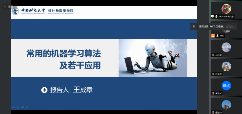 王成章副教授以《常用的机器学习算法及若干应用》为题向我们介绍了机器学习的历史、功能、算法和应用,并从算法的基本原理出发,展示不同算法的思想,然后利用生动地例子向我们展示了不同算法的利弊。报告中王成章副教授将机器学习的算法按照功能分成关联规则发现、聚类分析、维度约简、分类分析、预测分析六类,简单清晰地展示了机器学习的宏观框架,基于此给出了机器学习在银行、房地产、农业、货币政策等多方面的应用。在此基础上王成章副教授引入深度学习这个新兴的机器学习领域,向我们展示了机器学习最前沿的研究方向。