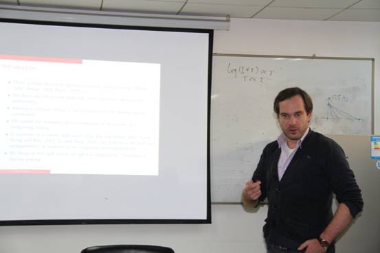 2019年12月3日下午,中国精算研究院邀请到荷兰阿姆斯特丹大学TimBoonen副教授在中国精算研究院会议室作题为“Optimalreinsurance with multiple reinsurers: Competitive pricing and coalitionstability”的报告。此次学术报告为我校龙马奋进·校庆70周年学术系列讲座,暨我院精算论坛第167期。本次讲座由池义春副院长主持,我院孟辉研究员、伍慧玲研究员、董洪斌副研究员及部分研究生参加。