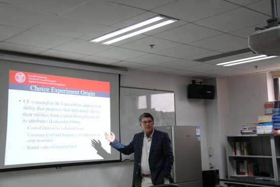 在学术报告中,Turvey教授认为在保险费和保障水平缺乏外生差异的情况下,很难得到农业保险的需求、农业保险的主要驱动因素或者属性(attributes)。本次报告概述了他领导的团队在2018—2019年使用“in-the-field”选择实验法对山东、四川、陕西、河南和江苏的农作物保险需求进行调查的情况。本次报告描述了该选择实验法的D-最优结构(the art)以及如何将该结构应用于田野实验(the practice)。研究的结果专注于从混合Logit和条件Logit模型得出农民对农业保险的不同支付意愿。Turvey教授认为,在中国开展农业保险的田野实验方法研究是十分有必要的,对于完善我国农业保险制度、实现“三农”政策具有重要的理论和实践意义。
