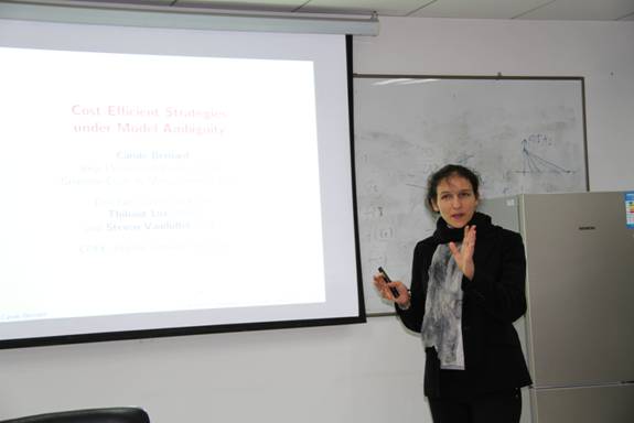 2018年1月4日上午10点-11点在学术会堂精算会议室506室,我院荣幸的邀请到了来自法国格伦诺贝尔管理学院(Grenoble Ecole de Management,France)的Carole Bernard教授为我院师生带来题为“Cost efficientstrategies under model ambiguity”的学术报告。 此次报告是我院第127期精算论坛,我院周明副院长、池义春研究院、孟辉研究院、吴慧玲副研究员、韦晓副教授、刘敬真副教授等师生参加了此次论坛。